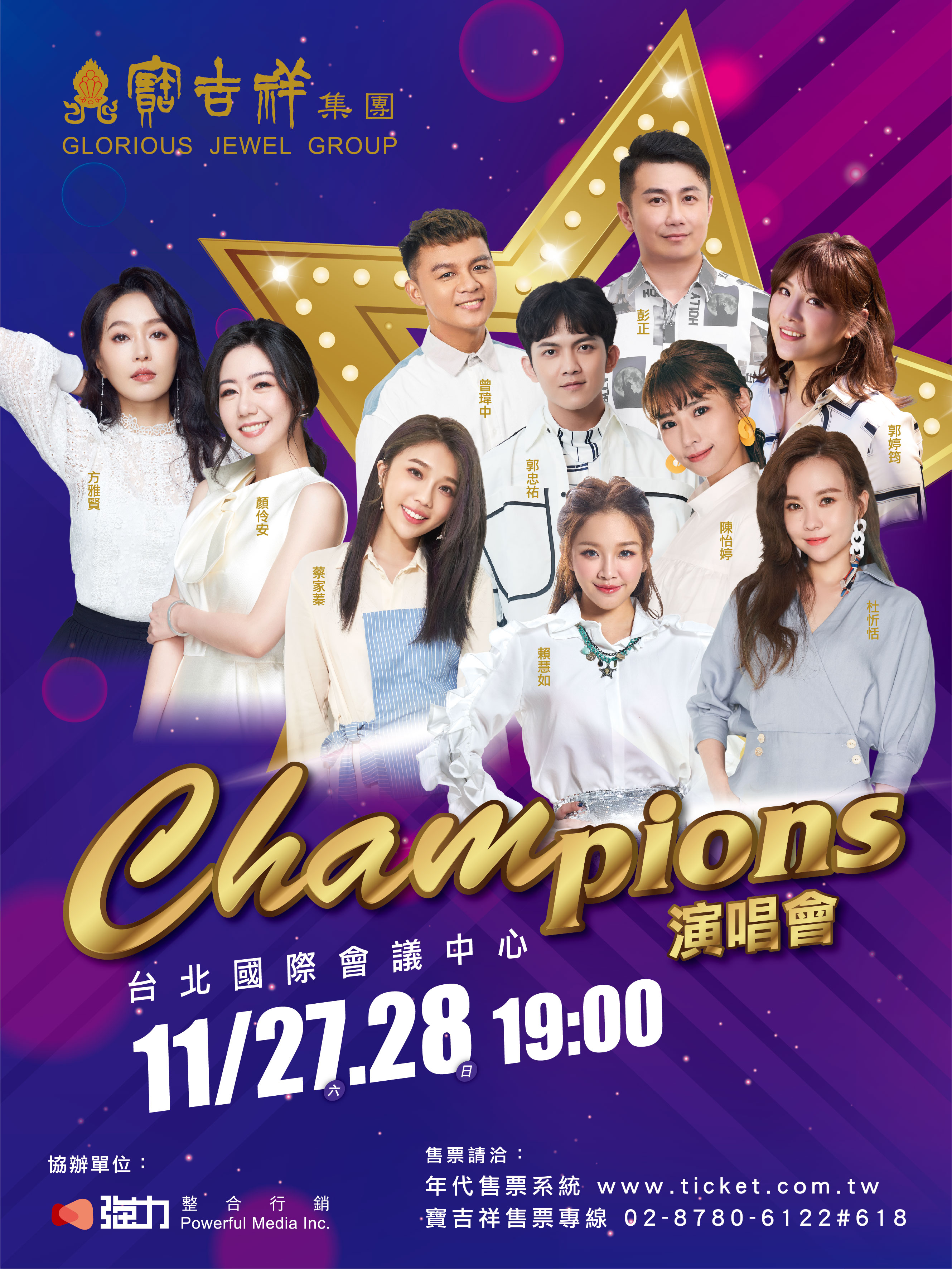 寶吉祥集團舉辦的「Champions」演唱會11/27~28將於台北國際會議中心登場! 「Champions」演唱會卡司堅強,由8位「明日之星」歌唱比賽出道的冠軍歌手與寶吉祥集團方雅賢、顏伶安共同擔綱演出。主持「明日之星」的綜藝天王胡瓜,一路陪伴這些冠軍歌手們成長茁壯,21日亦受邀出席宣傳記者會擔任嘉賓。門票22日起於年代售票系統開始發售!